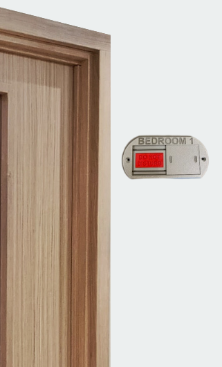 The unit is surface mounted to the corridor side of the door using tamper-resistant security screws, ensuring it remains securely in place in high-use environments.
